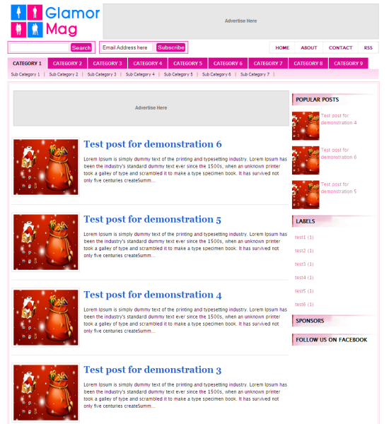In this blogger template you will find amazing professional horizontal navigation which can accommodate all your categories in your blog and its pink color will suit female templates layout. You can see two 728×90 ads slots to get maximum clicks for your sponsors.